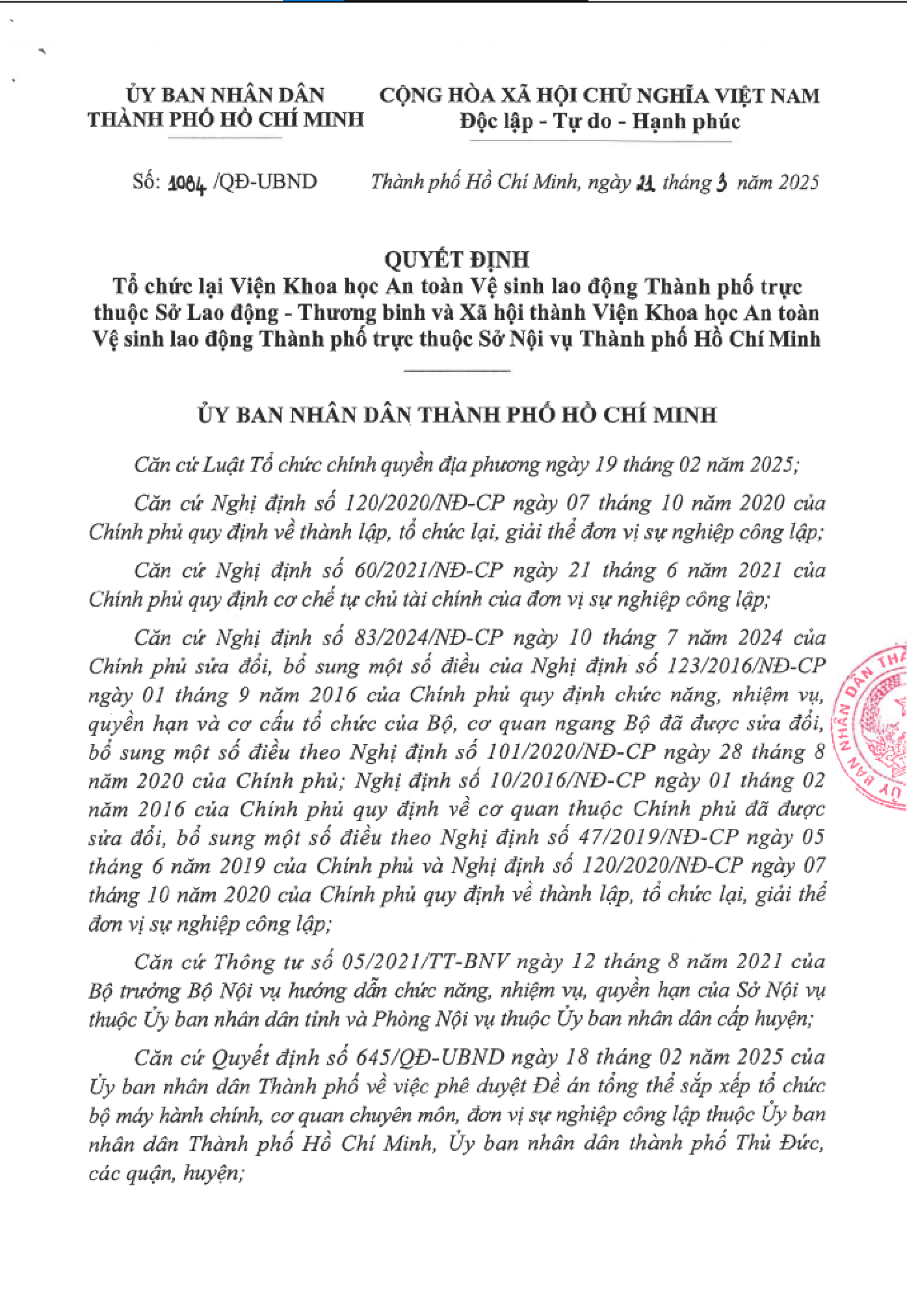 Viện Khoa học An toàn Vệ sinh lao động Thành phố (sau đây gọi tắt là Viện) là đơn vị sự nghiệp công lập, tự đảm bảo toàn bộ chi phí hoạt động thường xuyên và đầu tư, được thành lập theo Quyết định 958/QĐ-UBND ngày 29/09/2025 của Ủy ban nhân dân TP. Hồ Chí Minh.